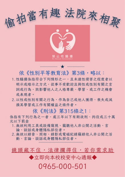 尊重自己與他人,勿觸犯法規損人不利己,如遭遇疑似偷拍情事,請通報校安中心協助您。
